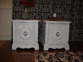 I found these end tables/nightstands and thought they were begging for my help. I was surprised & pleased with the way they turned out- the sides have an almost beadboard design which really added to the style & distressing. Love, love them now- they would look lovely in a living room or next to a bed (even mine!) I also refinished a pedestal table I've had for several years- the curves are really pretty and stand out with the white paint. They're all looking for a new home...